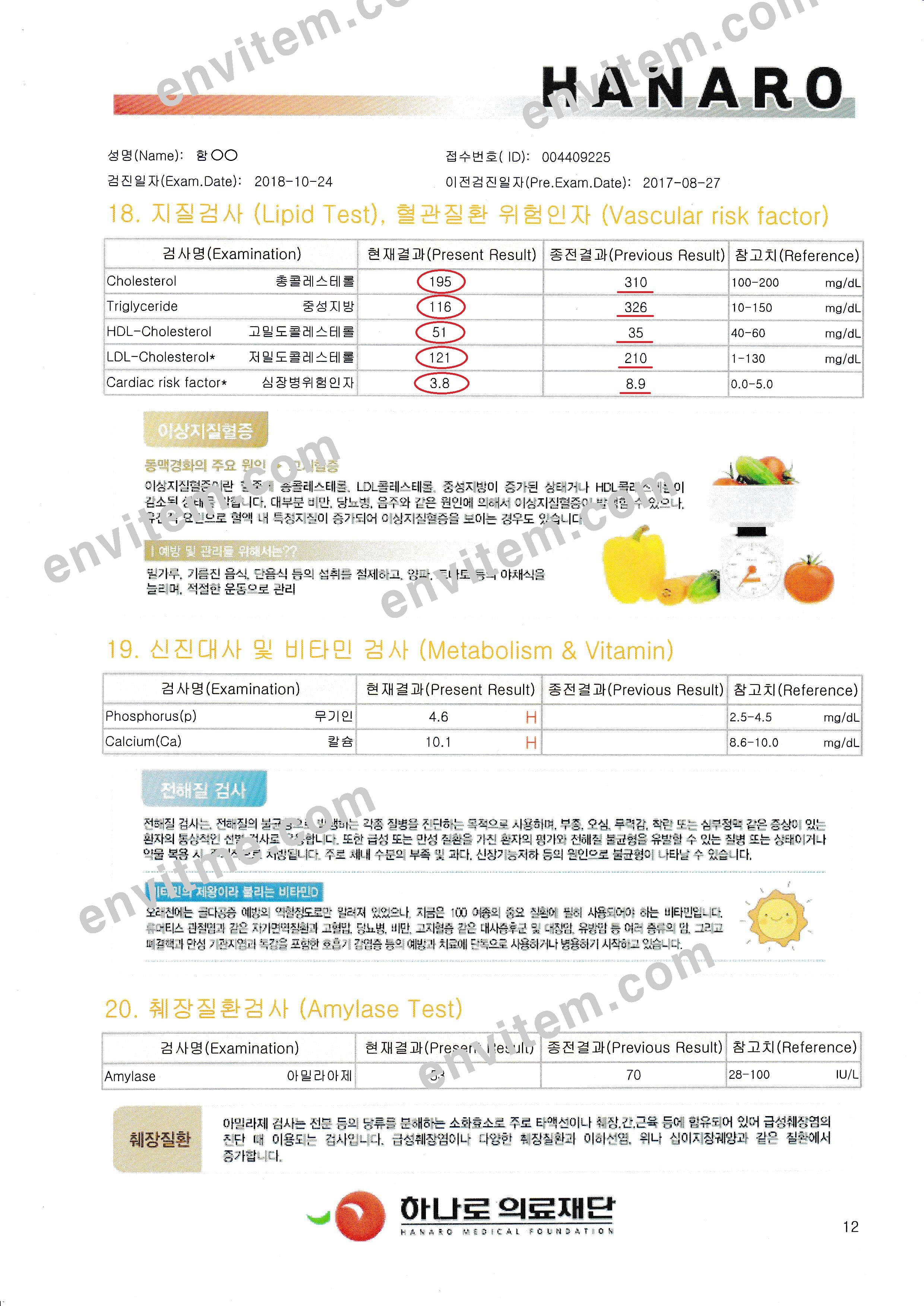 "회사에서 실시하는 종합건강검진 결과 작년에 비해 혈당도 줄고 콜레스테롤도 줄었어요.